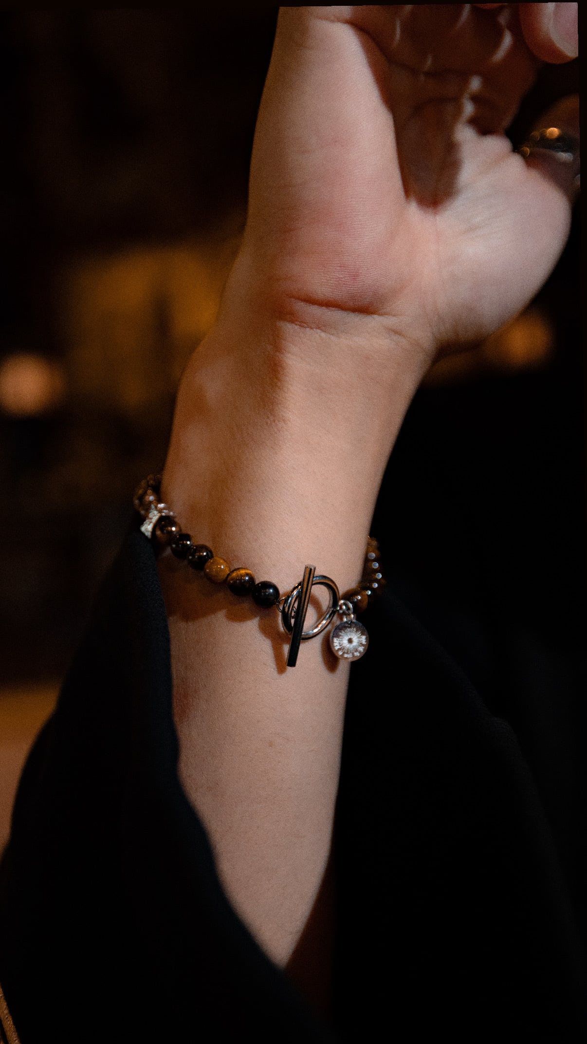 落ち着いたブラウンとシルバーのコントラストが手元を引き締め、