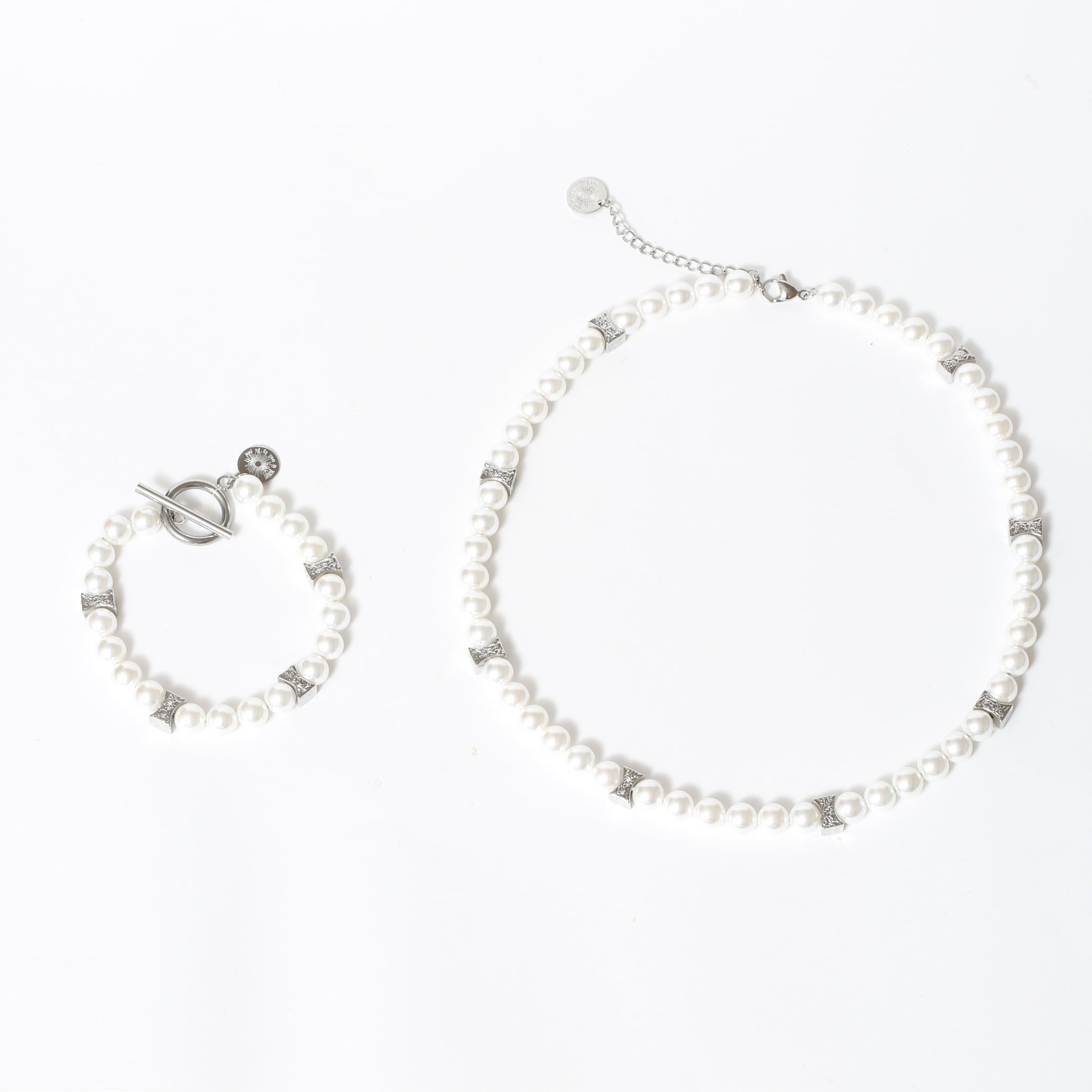 淡水パールの柔らかな光沢とステンレスの輝きが織りなすコントラストは、